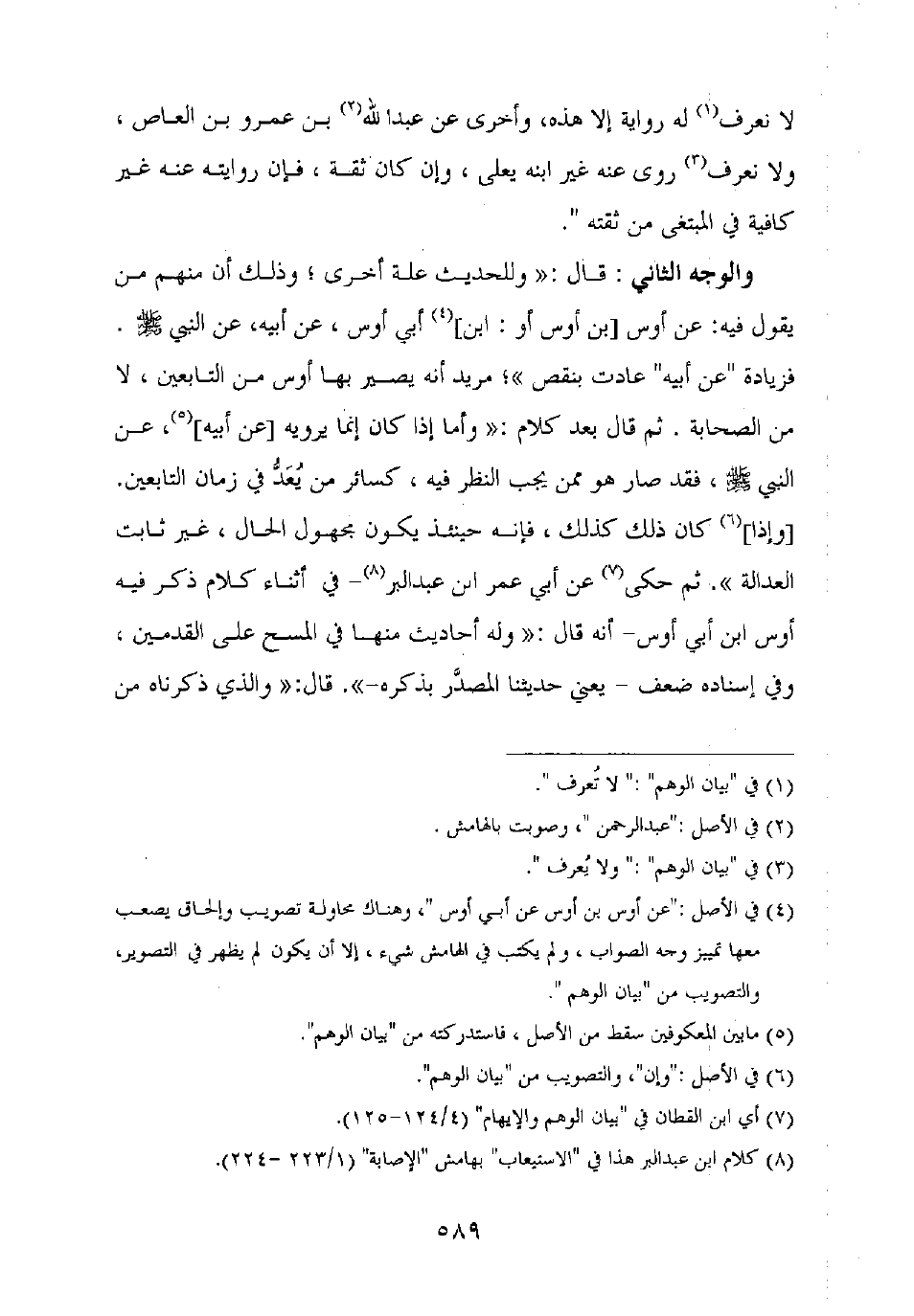 [وإذا] كان ذلك كذلك، فإنه حينئذ يكون مجهول الحال، غير ثابت العدالة ". ثم حكى عن أبي عمر ابن عبد البر – في أثناء كلام ذكر فيه أوس بن أبي أوس – أنه قال: "وله أحاديث منها في المسح على القدمين، وفي إسناده ضعف – يعني حديثنا المصدر بذكره - ". قال: "والذي ذكرناه من