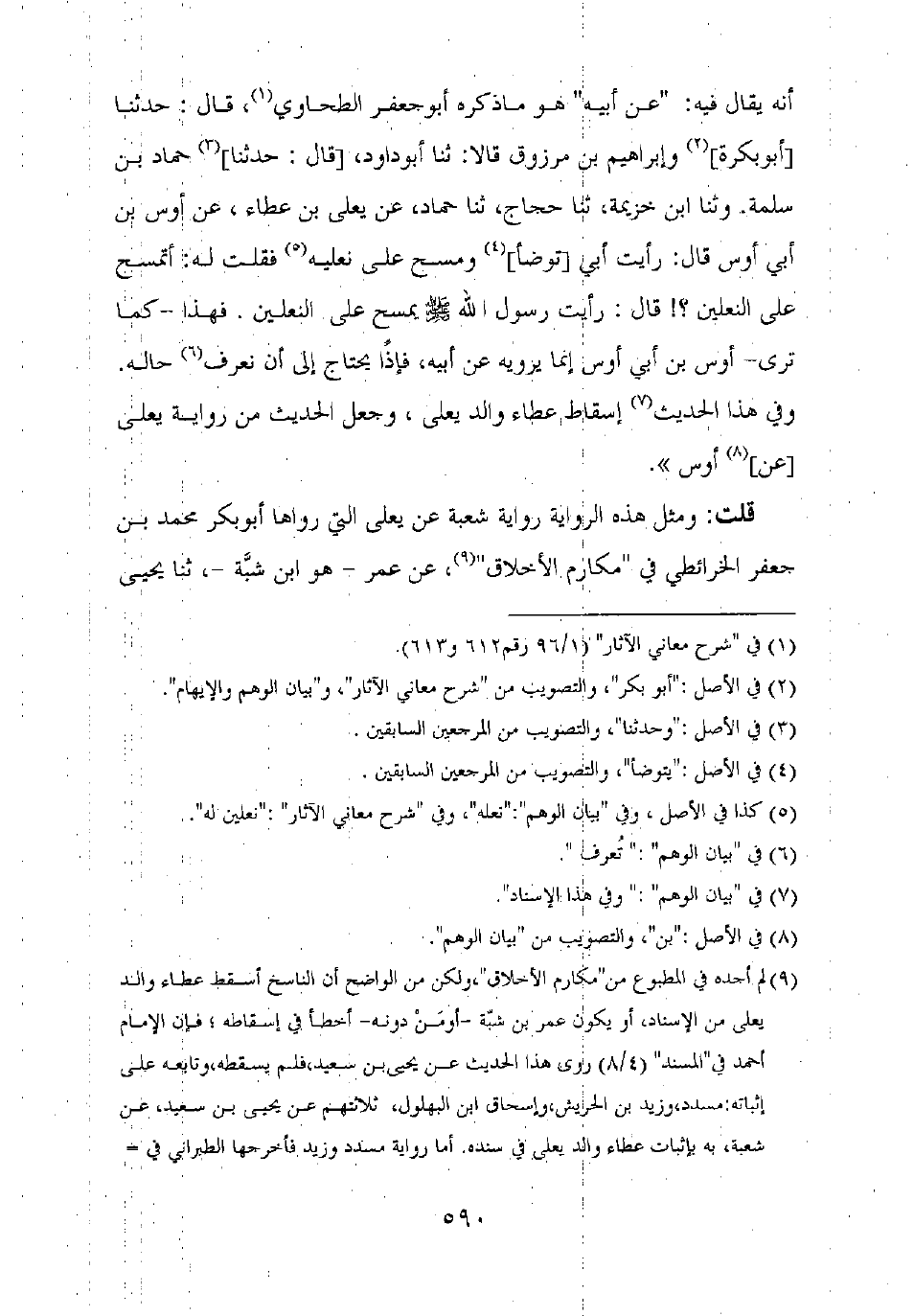 أنه يقال فيه: "عن أبيه" هو ما ذكره أبو جعفر الطحاوي، قال: حدثنا [أبو بكرة] وإبراهيم بن مرزوق قالا: ثنا أبو داود، [قال: حدثنا] حماد بن سلمة. وثنا ابن خزيمة، ثنا حجاج، ثنا حماد، عن يعلى بن عطاء، عن أوس بن أبي أوس: رأيت أبي [توضأ] ومسح على نعليه فقلت له: أتمسح على النعلين؟! قال: رأيت رسول الله صلى الله عليه وسلم يمسح على النعلين. فهذا – كما ترى – أوس بن أبي أوس إنما يرويه عن أبيه، فإذا يحتاج إلى أن نعرف حاله.