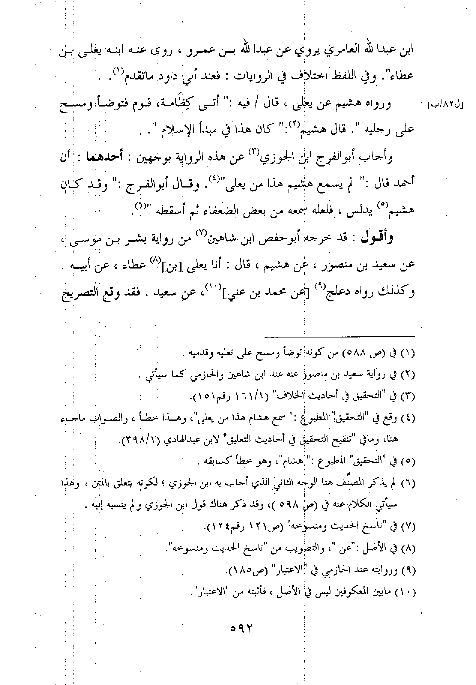 ورواه هشيم عن يعلى، قال فيه: "أتى كظامة قوم فتوضأ ومسح على رجليه". قال هشيم: "كان هذا في مبدأ الإسلام".