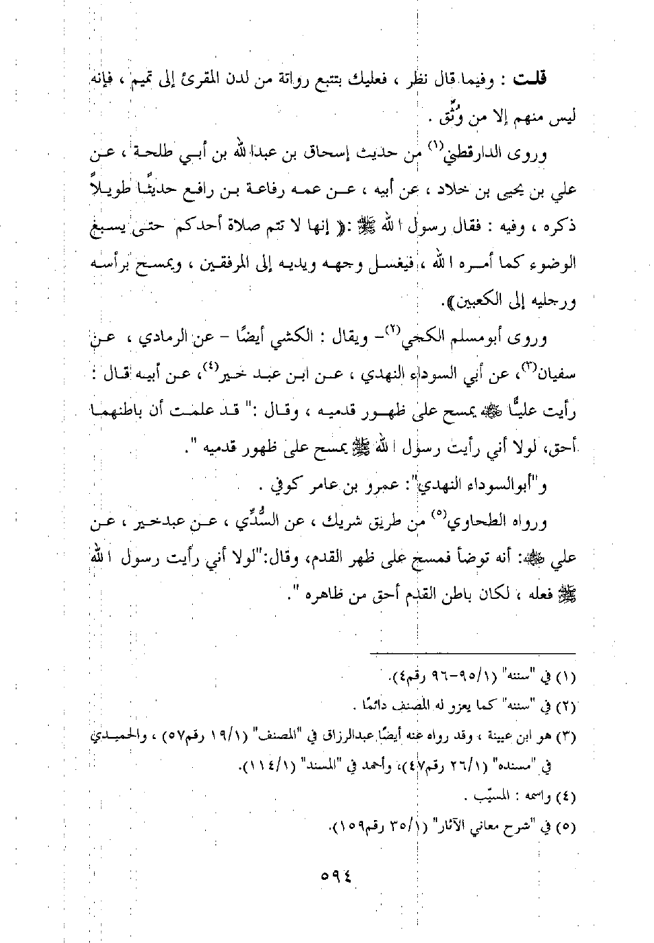 وروى أبو مسلم الكجي – ويقال: الكشي أيضا – عن الرمادي، عن سفيان، عن أبي السوداء النهدي، عن ابن عبد خير، عن أبيه قال: رأيت عليا رضي الله عنه يمسح على ظهور قدميه وقال: "قد علمت أن باطنهما أحق، لولا أني رأيت رسول الله صلى الله عليه وسلم يمسح على ظهور قدميه".