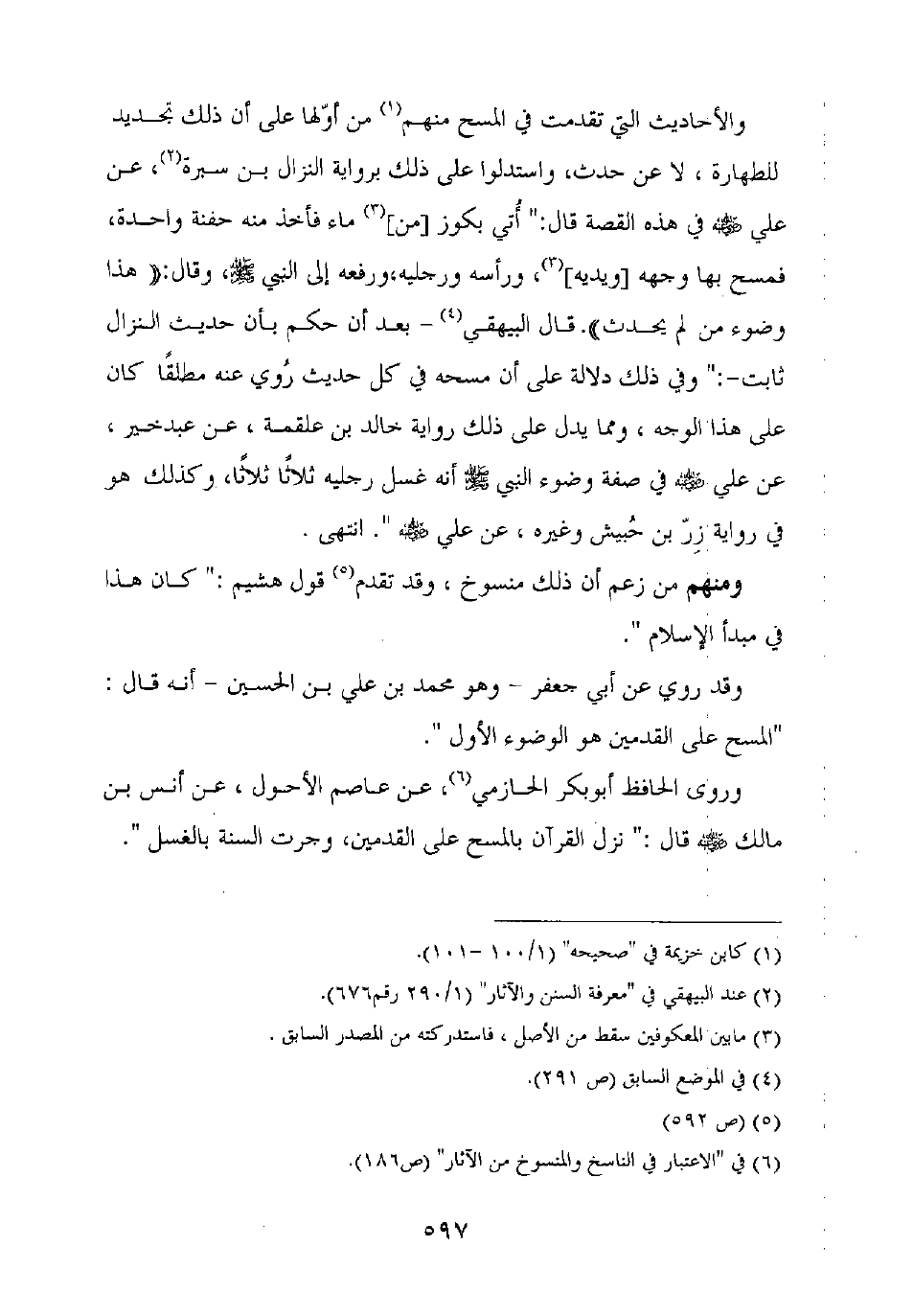 وروى الحافظ أبو بكر الحازمي، عن عاصم الأحول، عن أنس بن مالك رضي الله عنه قال: "نزل القرآن بالمسح على القدمين، وجرت السنة بالغسل".