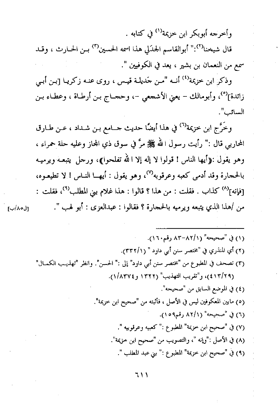 وخرج ابن خزيمة في هذا أيضا حديث جامع بن شداد، عن طارق المحاربي قال: "رأيت رسول الله صلى الله عليه وسلم مر في سوق ذي المجاز وعليه حلة حمراء، وهو يقول: "أيها الناس! قولوا لا إله إلا الله تفلحوا"، ورجل يتبعه ويرميه بالحجارة وقد أدمى كعبه وعرقوبه، وهو يقول: أيها الناس! لا تطيعوه، [فإنه] كذاب. فقلت: من هذا؟ قالوا: هذا غلام بني المطلب، فقلت: من هذا الذي يتبعه ويرميه بالحجارة؟ فقالوا: عبد العزى: أبو لهب".