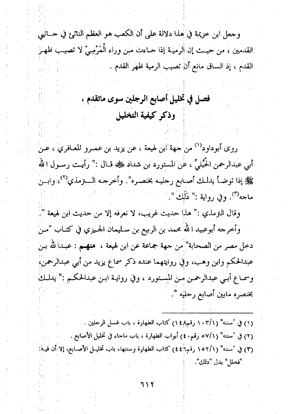 روى أبو داود من جهة ابن لهيعة، عن يزيد بن عمرو المعافري، عن أبي عبد الرحمن الحبلي، عن المستورد بن شداد رضي الله عنه قال: "رأيت رسول الله صلى الله عليه وسلم إذا توضأ يدلك أصابع رجليه بخنصره". وأخرجه الترمذي، وابن ماجه. وفي رواية: "دلك".