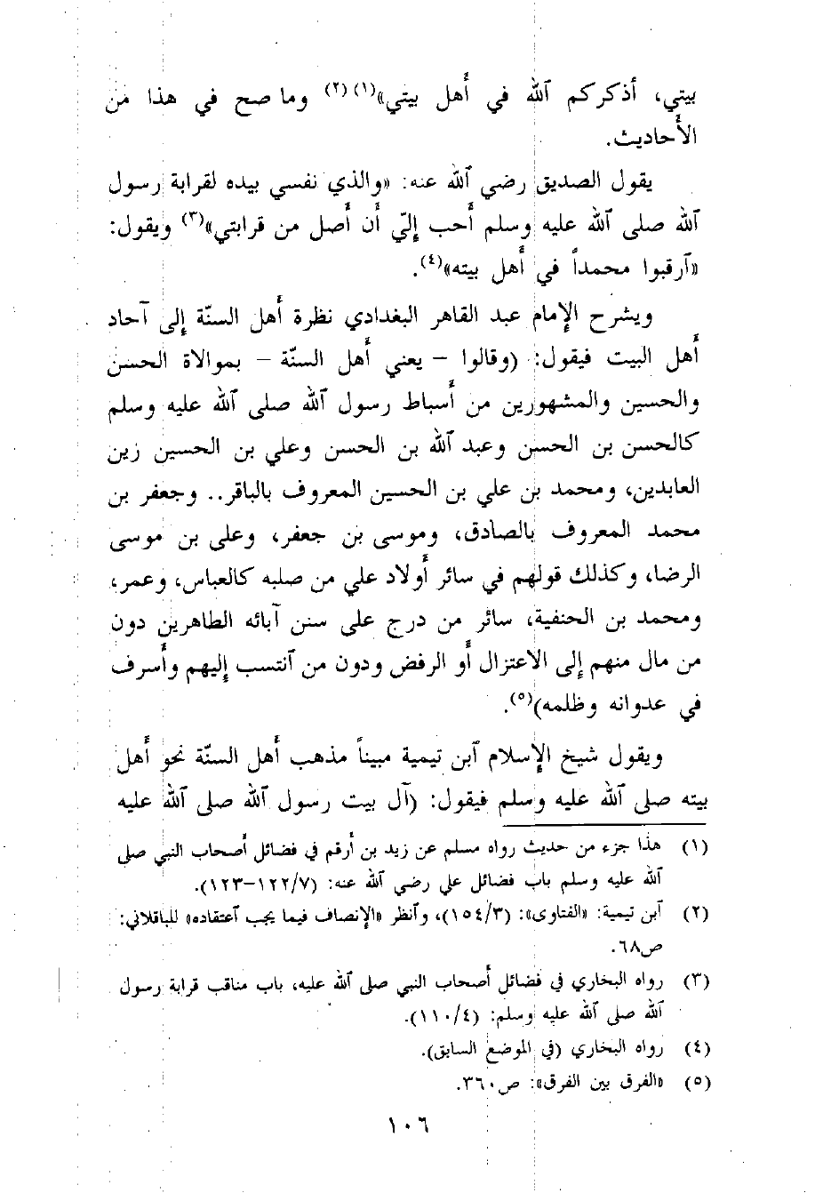 ويشرح الإمام عبد القاهر البغدادي نظرة أهل السنّة إلى آحاد أهل البيت فيقول: (وقالوا - يعني أهل السنّة - بموالاة الحسن والحسين والمشهورين من أسباط رسول الله - صلى الله عليه وسلم - كالحسن بن الحسن وعبد الله بن الحسن وعلي بن الحسين زين العابدين، ومحمد بن علي بن الحسين المعروف بالباقر.. وجعفر بن محمد المعروف بالصادق، وموسى بن جعفر، وعلي بن موسى الرضا، وكذلك قولهم في سائر أولاد علي من صلبه كالعباس، وعمر، ومحمد بن الحنفية، سائر من درج على سنن آبائه الطاهرين دون من مال منهم إلى الاعتزال أو الرفض ودون من انتسب إليهم وأسرف في عدوانه وظلمه) (¬5) .