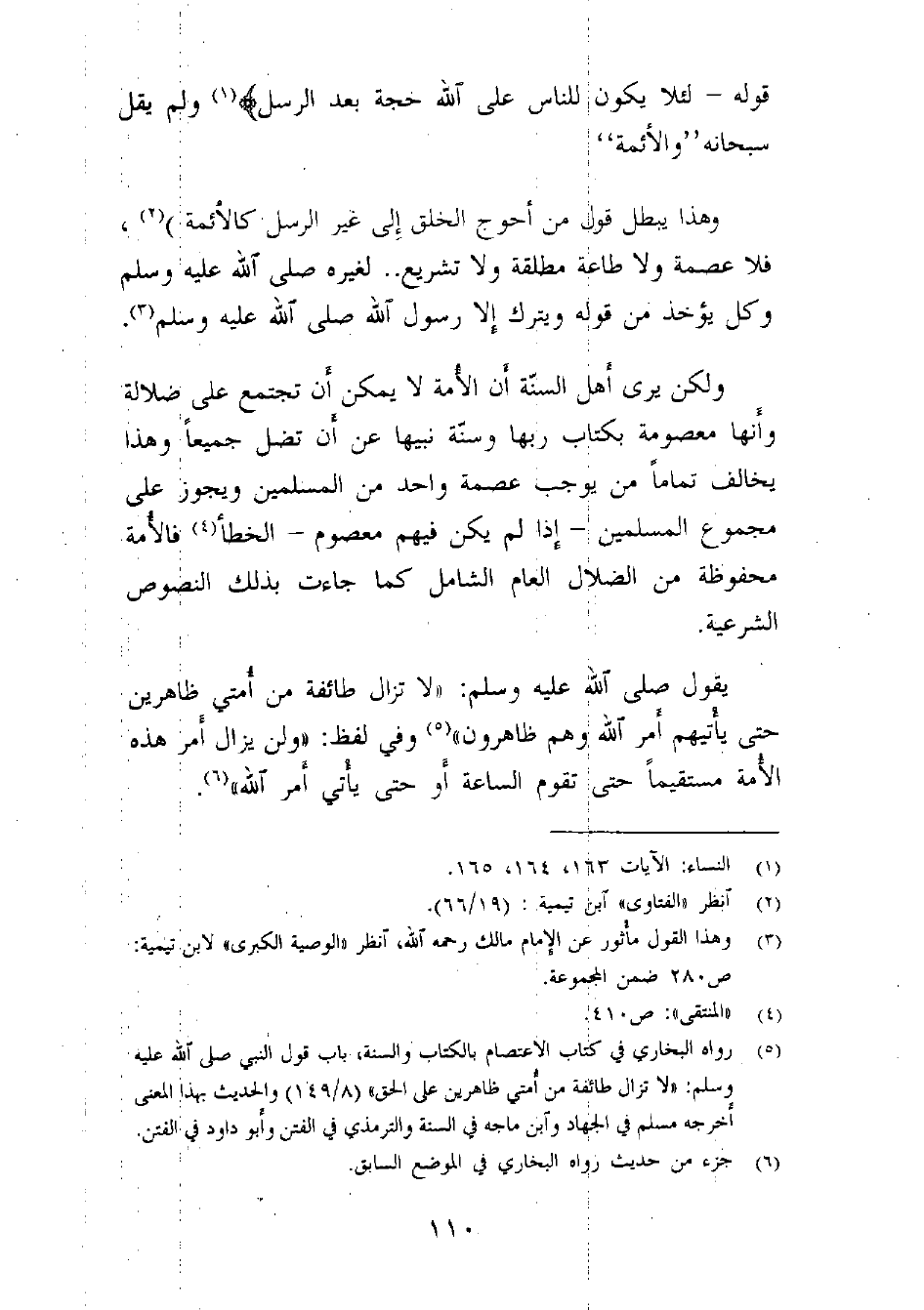 (¬5) رواه البخاري في كتاب الاعتصام بالكتاب والسنة، باب قول النبي - صلى الله عليه وسلم -: «لا تزال طائفة من أمتي ظاهرني على الحق» (8/ 149) ، والحديث بهذا المعنى أخرجه مسلم في الجهاد وابن ماجه في السنة والترمذي في الفتن وأبو داود في الفتن.