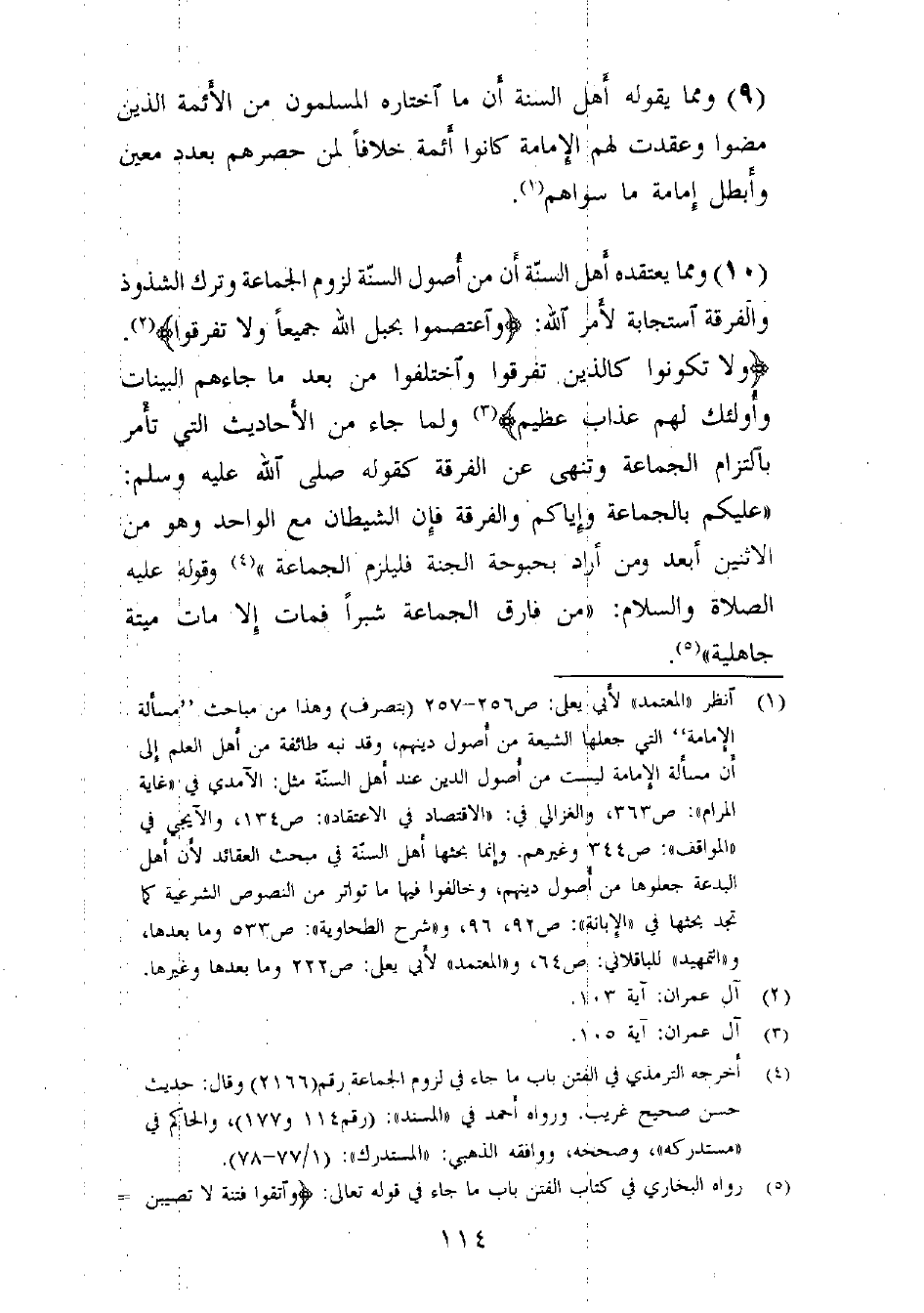 10- ومما يعتقده أهل السنّة أن من أصول السنة لزوم الجماعة وترك الشذوذ والفرقة استجابة لأمر الله: (وَاعْتَصِمُوا بِحَبْلِ اللَّهِ جَمِيعًا وَلَا تَفَرَّقُوا) (¬2) . (وَلَا تَكُونُوا كَالَّذِينَ تَفَرَّقُوا وَاخْتَلَفُوا مِنْ بَعْدِ مَا جَاءَهُمُ الْبَيِّنَاتُ وَأُولَئِكَ لَهُمْ عَذَابٌ عَظِيمٌ) (¬3) ولما جاء من الأحاديث التي تأمر بالتزام الجماعة وتنهى عن الفرقة كقوله - صلى الله عليه وسلم -: «عليكم بالجماعة وإياكم والفرقة فإن الشيطان مع الواحد وهو من الاثنين أبعد ومن أراد بحبوحة الجنة فليلزم الجماعة» (¬4) وقوله عليه الصلاة والسلام: «من فارق الجماعة شبراً فمات إلا مات ميتة جاهلية» (¬5) .
