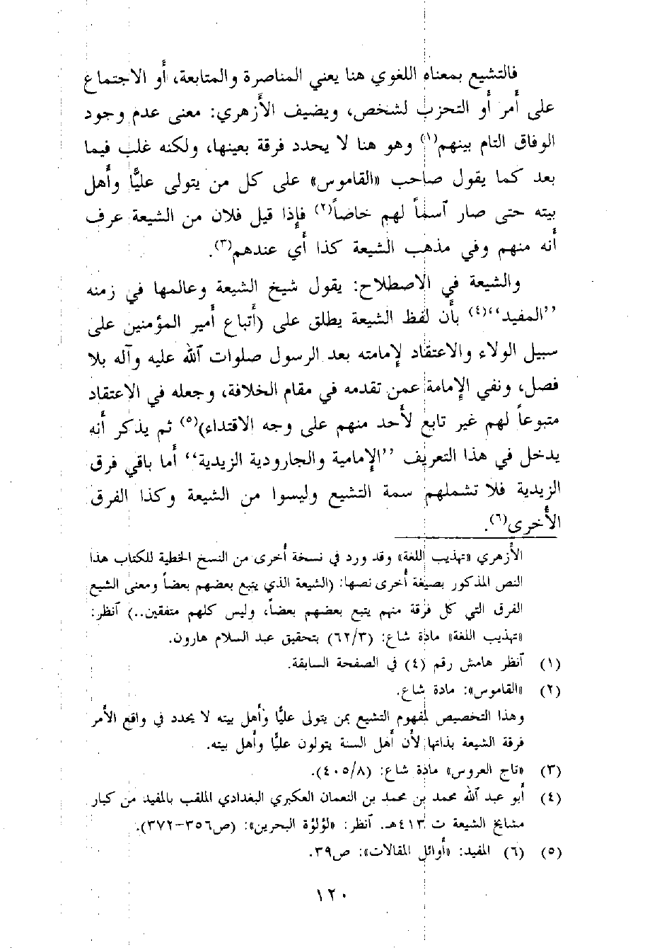 = الأزهري «تهذيب اللغة» ، وقد ورد في نسخة أخرى من النسخ الخطية للكتاب هذا النص المذكور بصيغة أخرى نصها: (الشيعة: الذي يتبع بعضهم بعضاً، ومعنى الشيع: الفرق التي كل فرقة منهم يتبع بعضهم بعضاً، وليس كلهم متفقين..) انظر: «تهذيب اللغة» مادة شاع: (3/62) بتحقيق عبد السلام هارون.