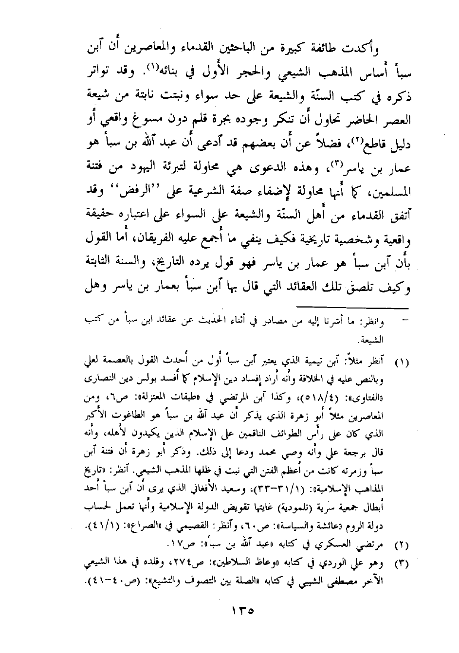 وأكدت طائفة كبيرة من الباحثين القدماء والمعاصرين أن ابن سبأ أساس المذهب الشيعي والحجر الأول في بنائه (¬1) . وقد تواتر ذكره في كتب السنّة والشيعة على حد سواء ونبتت نابتة من شيعة العصر الحاضر تحاول أن تنكر وجوده بجرة قلم دون مسوغ واقعي أو دليل قاطع (¬2) ، فضلاً عن أن بعضهم قد ادعى أن عبد الله بن سبأ هو عمار بن ياسر (¬3) ، وهذه الدعوى هي محاولة لتبرئة اليهود من فتنة المسلمين، كما أنها محاولة لإضفاء صفة الشرعية على "الرفض"، وقد اتفق القدماء من أهل السنّة والشيعة على السواء على اعتباره حقيقة واقعية وشخصية تاريخية، فكيف ينفي ما أجمع عليه الفريقان؟، أما القول بأن ابن سبأ هو عمار بن ياسر فهو قول يرده التاريخ والسنة الثابتة، وكيف تلصق تلك العقائد التي قال بها ابن سبأ بعمار بن ياسر، وهل