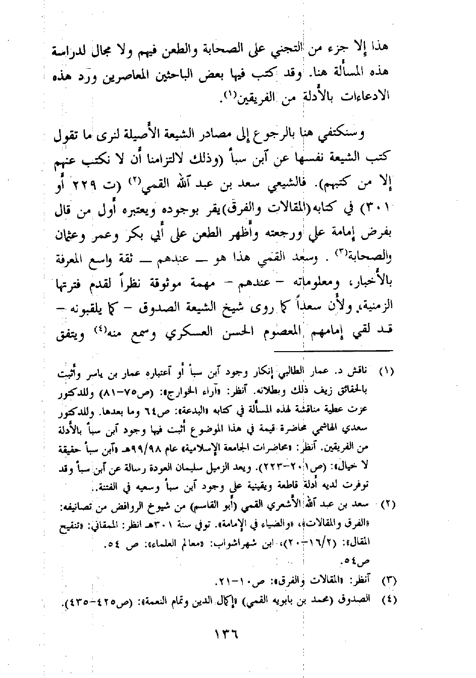 وسنكتفي هنا بالرجوع إلى مصادر الشيعة الأصيلة لنرى ما تقول كتب الشيعة نفسها عن ابن سبأ (وذلك لالتزامنا أن لا نكتب عنهم إلا من كتبهم) . فالشيعي سعد بن عبد الله القمي (¬2) (ت 229 أو 301) في كتابه (المقالات والفرق) يقر بوجوده ويعتبره أول من قال بفرض إمامة علي ورجعته وأظهر الطعن على أبي بكر وعمر وعثمان والصحابة (¬3) . وسعد القمي هذا هو - عندهم - ثقة واسع المعرفة بالأخبار، ومعلوماته - عندهم - مهمة موثوقة نظراً لقدم فترتها الزمنية، ولأن سعداً كما روى شيخ الشيعة الصدوق - كما يلقبونه - قد لقي إمامهم المعصوم الحسن العسكري وسمع منه (¬4) ، ويتفق