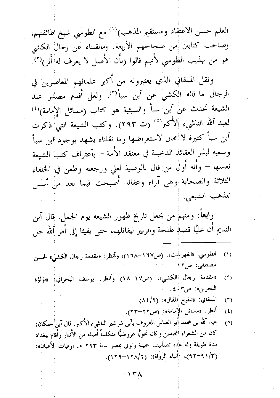 ونقل الممقاني ـ الذي يعتبرونه من أكبر علمائهم المعاصرين في الرجال ـ ما قاله الكشي عن ابن سبأ (¬3) . ولعل أقدم مصدر عند الشيعة تحدث عن ابن سبأ والسبئية هو كتاب (مسائل الإمامة) (¬4) لعبد الله الناشئ الأكبر (¬5) (ت 293) . وكتب الشيعة التي ذكرت ابن سبأ كثيرة لا مجال لاستعراضها، وما نقلناه يشهد بوجود ابن سبأ وسعيه لبذر العقائد الدخيلة في معتقد الأمة - باعتراف كتب الشيعة نفسها - وأنه أول من قال بالوصية لعلي ورجعته وطعن في الخلفاء الثلاثة والصحابة، وهي آراء وعقائد أصبحت فيما بعد من أسس المذهب الشيعي.