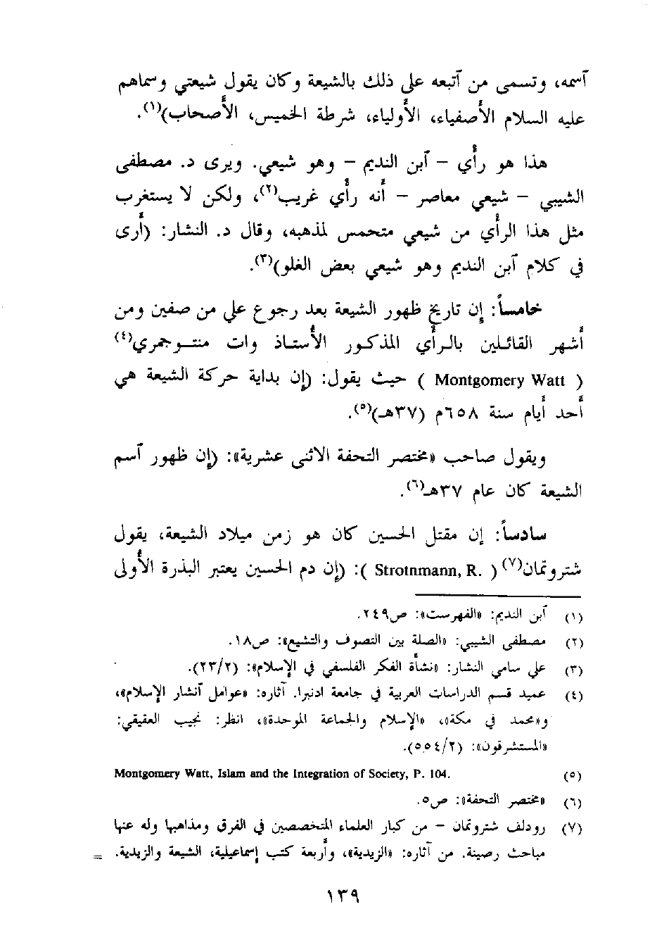 خامساً: إن تاريخ ظهور الشيعة بعد رجوع علي من صفين. ومن أشهر القائلين بالرأي المذكور الأستاذ وات منتوجمري (¬4) (Montgomery Watt) حيث يقول: (إن بداية حركة الشيعة هي أحد أيام سنة 658م -37هـ) (¬5) .