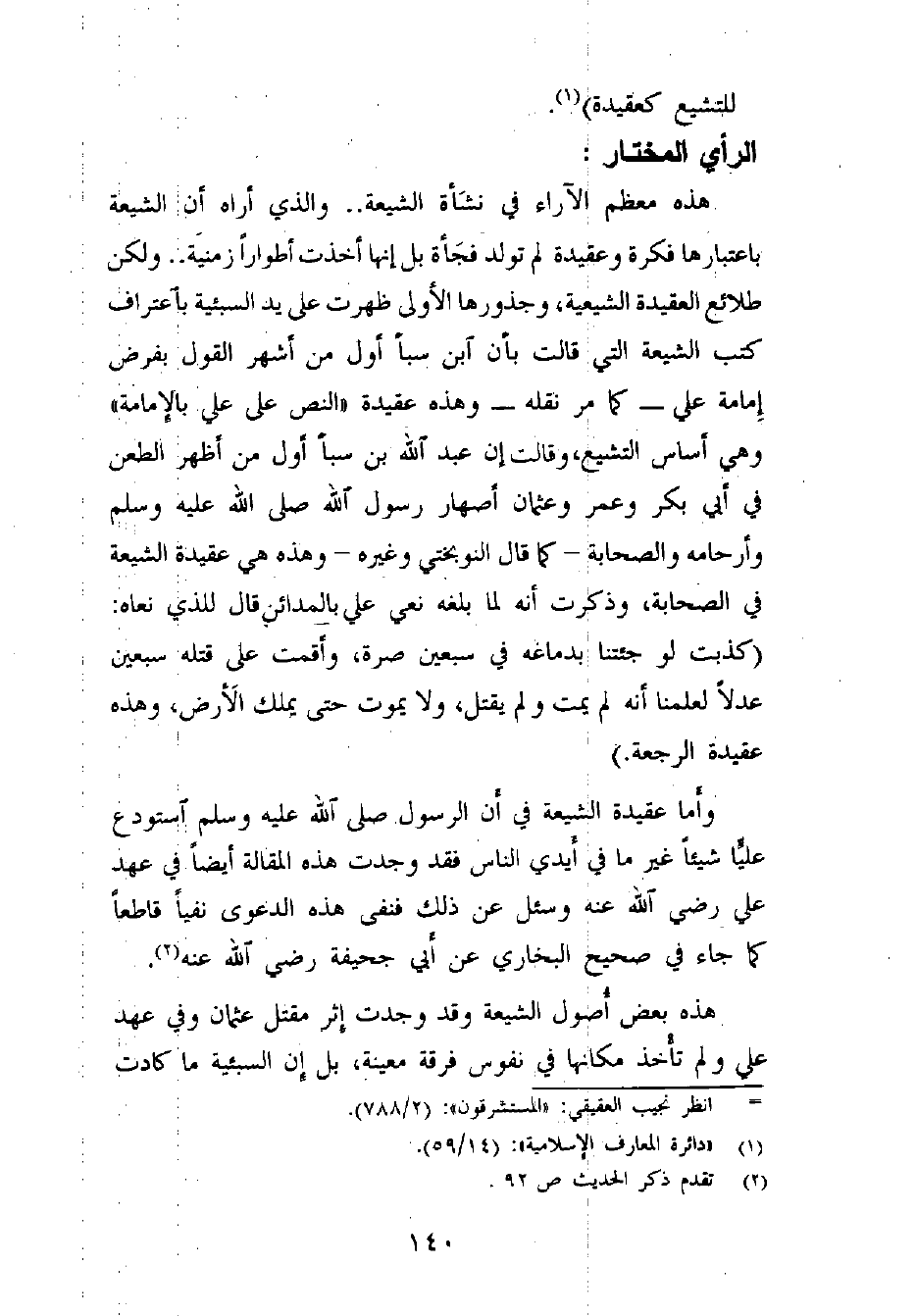 هذه معظم الآراء في نشأة الشيعة ... والذي أراه أن الشيعة باعتبارها فكرة وعقيدة لم تولد فجأة، بل إنها أخذت أطواراً زمنية.. ولكن طلائع العقيدة الشيعية، وجذورها الأولى ظهرت على يد السبئية باعتراف كتب الشيعة التي قالت بأن ابن سبأ أول من أشهر القول بفرض إمامة علي - كما مر نقله - وهذه عقيدة «النص على علي بالإمامة» وهي أساس التشيع، وقالت: إن عبد الله بن سبأ أول من أظهر الطعن في أبي بكر وعمر وعثمان أصهار رسول الله ? وأرحامه والصحابة - كما قال النوبختي وغيره - وهذه هي عقيدة الشيعة في الصحابة، وذكرت أنه لما بلغه نعي علي بالمدائن قال للذي نعاه: (كذبت، لو جئتنا بدماغه في سبعين صرة، وأقمت على قتله سبعين عدلاً لعلمنا أنه لم يمت ولم يقتل، ولا يموت حتى يملك الأرض، وهذه عقيدة الرجعة) .