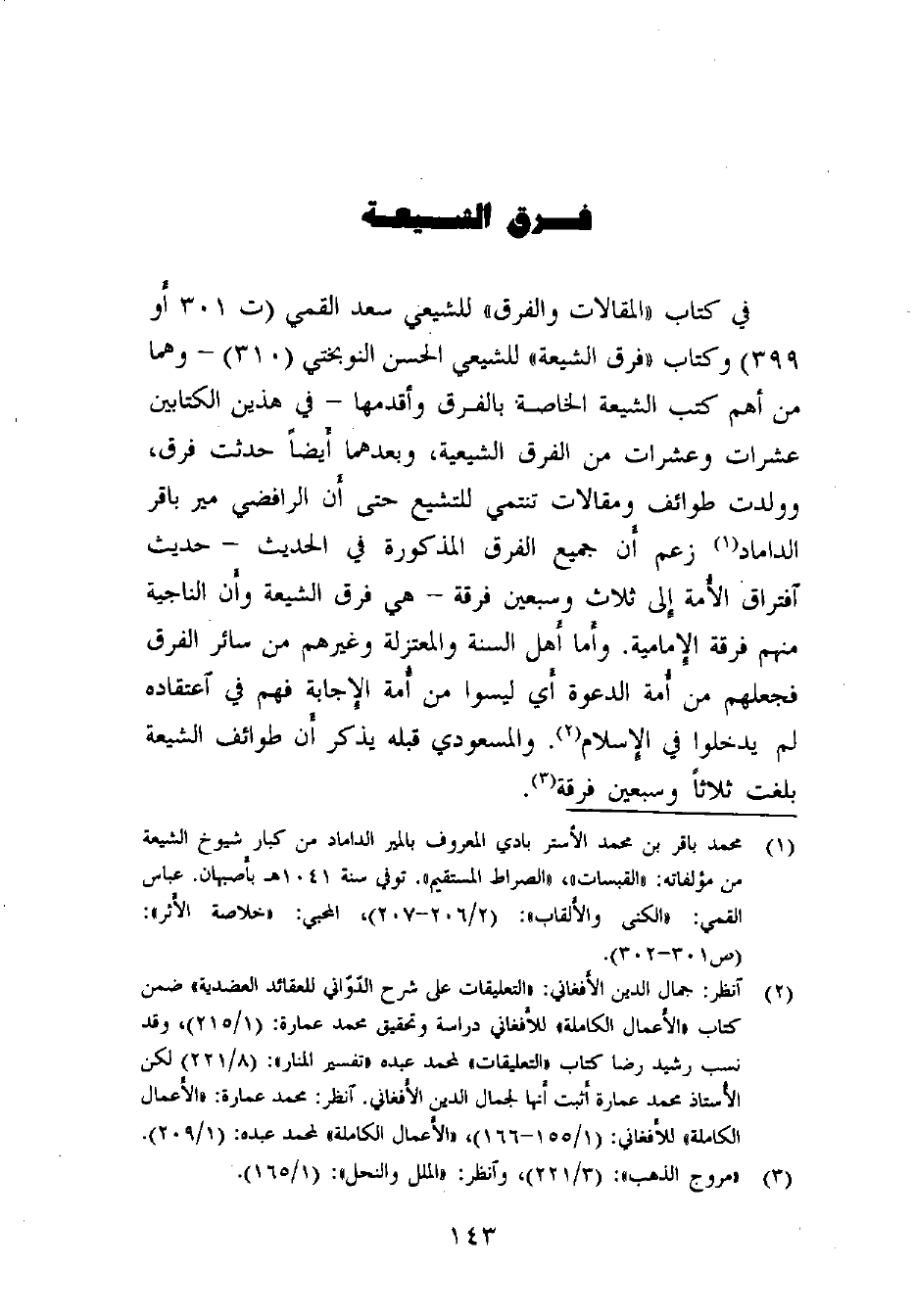 في كتاب «المقالات والفرق» للشيعي سعد القمي (ت 301 أو 399) وكتاب «فرق الشيعة» للشيعي الحسن النوبختي (310) - وهما من أهم كتب الشيعة الخاصة بالفرق وأقدمها - في هذين الكتابين عشرات وعشرات من الفرق الشيعية، وبعدهما أيضاً حدثت فرق، وولدت طوائف ومقالات تنتمي للتشيع، حتى أن الرافضي مير باقر الداماد (¬1) زعم أن جميع الفرق المذكورة في الحديث - حديث افتراق الأمة إلى ثلاث وسبعين فرقة - هي فرق الشيعة وأن الناجية منهم فرقة الإمامية. وأما أهل السنة والمعتزلة وغيرهم من سائر الفرق فجعلهم من أمة الدعوة: ـ أي ليسوا من أمة الإجابة، فهم في اعتقاده لم يدخلوا في الإسلام (¬2) . والمسعودي قبله يذكر أن طوائف الشيعة بلغت ثلاثاً وسبعين فرقة (¬3) .