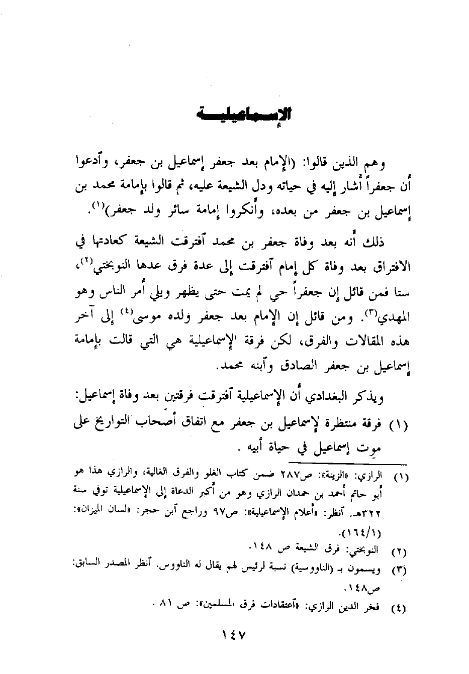 (1) فرقة منتظرة لإسماعيل بن جعفر، مع اتفاق أصحاب التواريخ على موت إسماعيل في حياة أبيه.