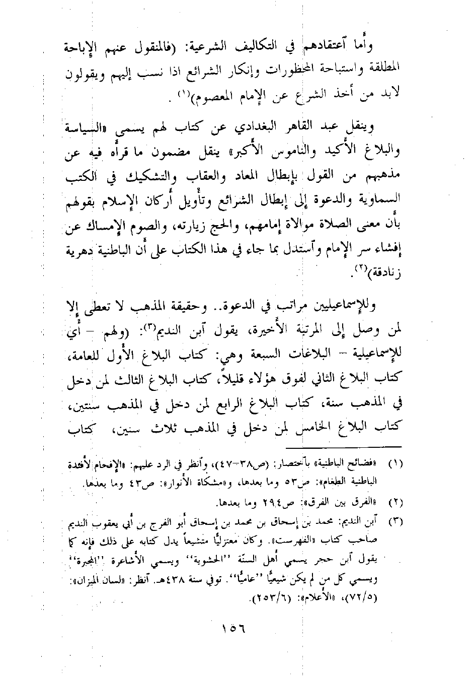 (¬3) ابن النديم: محمد بن إسحاق بن محمد بن إسحاق أبو الفرج بن أبي يعقوب النديم صاحب كتاب «الفهرست» . وكان معتزلياً متشيعاً يدل كتابه على ذلك، فإنه كما يقول ابن حجر يسمي أهل السنّة "الحشوية" ويسمي الأشاعرة "المجبرة" ويسمي كل من لم يكن شيعياً "عامياً"، توفي سنة 438هـ. انظر: «لسان الميزان» : (5/72) ، «الأعلام» : (6/253) .