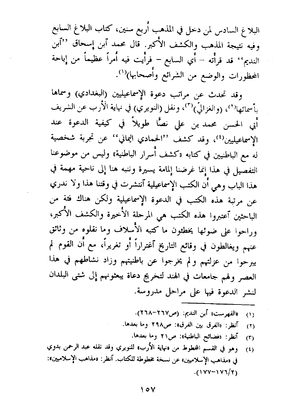 وقد تحدث عن مراتب دعوة الإسماعيليين (البغدادي) وسماها بأسمائها (¬2) ، (والغزالي) (¬3) ، ونقل (النويري) في نهاية الأَرب عن الشريف أبي الحسن محمد بن علي نصّاً طويلاً في كيفية الدعوة عند الإسماعيليين (¬4) ، وقد كشف "الحمادي اليماني" عن تجربة شخصية له مع الباطنيين في كتابه «كشف أسرار الباطنية» ، وليس من موضوعنا التفصيل في هذا، إنما غرضنا إلمامة يسيرة وننبه هنا إلى ناحية مهمة في هذا الباب؛ وهي أن الكتب الإسماعيلية انتشرت في وقتنا هذا ولا ندري عن مرتبة هذه الكتب في الدعوة الإسماعيلية، ولكن هناك فئة من الباحثين اعتبروا هذه الكتب هي المرحلة الأخيرة والكشف الأكبر، وراحوا على ضوئها يخطئون ما كتبه الأسلاف وما نقلوه من وثائق عنهم ويغالطون في وقائع التاريخ اغتراراً أو تغريراً، مع أن القوم لم يبرحوا من عزلتهم ولم يخرجوا عن باطنيتهم وزاد نشاطهم في هذا العصر ولهم جامعات في الهند لتخريج دعاة يبعثونهم إلى شتى البلدان لنشر الدعوة فيها على مراحل مدروسة.