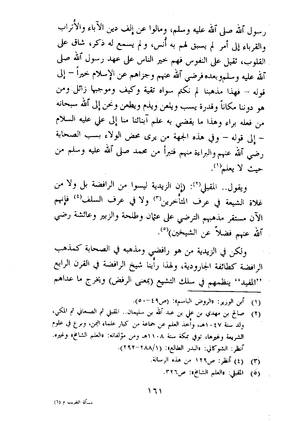 ويقول.. المقبلي (¬2) : (إن الزيدية ليسوا من الرافضة بل ولا من غلاة الشيعة في عرف المتأخرين (¬3) ولا في عرف السلف (¬4) . فإنهم الآن مستقر مذهبهم الترضي على عثمان وطلحة والزبير وعائشة - رضي الله عنهم - فضلاً عن الشيخين) (¬5) .