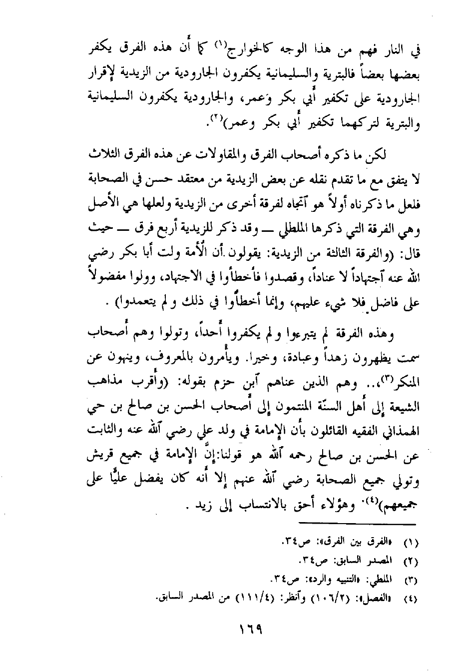 في النار، فهم من هذا الوجه كالخوارج (¬1) ، كما أن هذه الفرق يكفر بعضها بعضاً؛ فالبترية والسليمانية يكفرون الجارودية من الزيدية لإقرار الجارودية على تكفير أبي بكر وعمر، والجاردوية يكفرون السليمانية والبترية لتركهما تكفير أبي بكر وعمر) (¬2) .