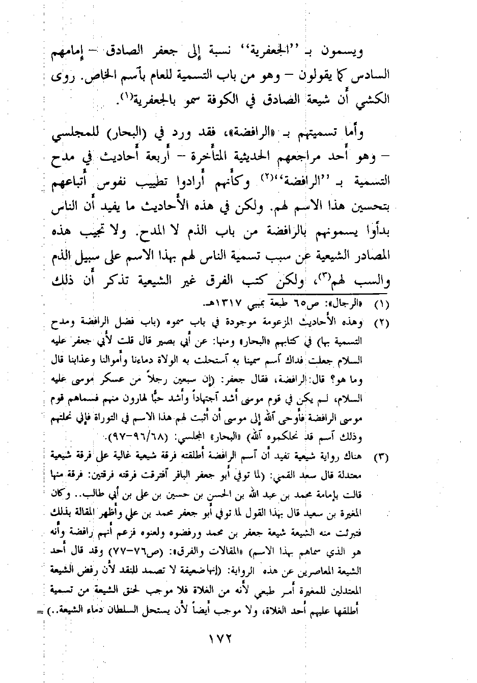 وأما تسميتهم بـ «الرافضة» ، فقد ورد في (البحار) للمجلسي - وهو أحد مراجعهم الحديثية المتأخرة - أربعة أحاديث في مدح التسمية بـ "الرافضة" (¬2) ، وكأنهم أرادوا تطييب نفوس أتباعهم بتحسين هذا الاسم لهم. ولكن في هذه الأحاديث ما يفيد أن الناس بدأوا يسمونهم بالرافضة من باب الذم لا المدح. ولا تجيب هذه المصادر الشيعية عن سبب تسمية الناس لهم بهذا الاسم على سبيل الذم والسب لهم (¬3) ، ولكن كتب الفرق غير الشيعية تذكر أن ذلك