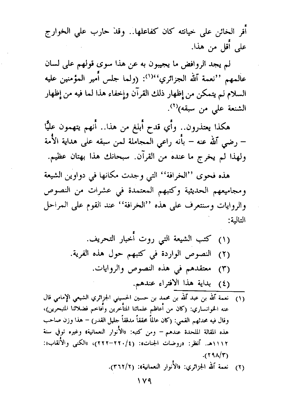 (¬1) نعمة الله بن عبد الله بن محمد بن حسين الحسيني الجزائري الشيعي الإمامي، قال عنه الخوانساري: (كان من أعاظم علمائنا المتأخرين وأفاخم فضلائنا المتبحرين) ، وقال فيه محدثهم القمي: (كان عالماً محققاً مدققاً جليل القدر) - هذا وزن صاحب هذه المقالة الملحدة عندهم - ومن كتبه: «الأنوار النعمانية» وغيره توفي سنة 1112هـ. انظر: «روضات الجنات» : (4/220-222) ، «الكنى والألقاب» : (3/298) .