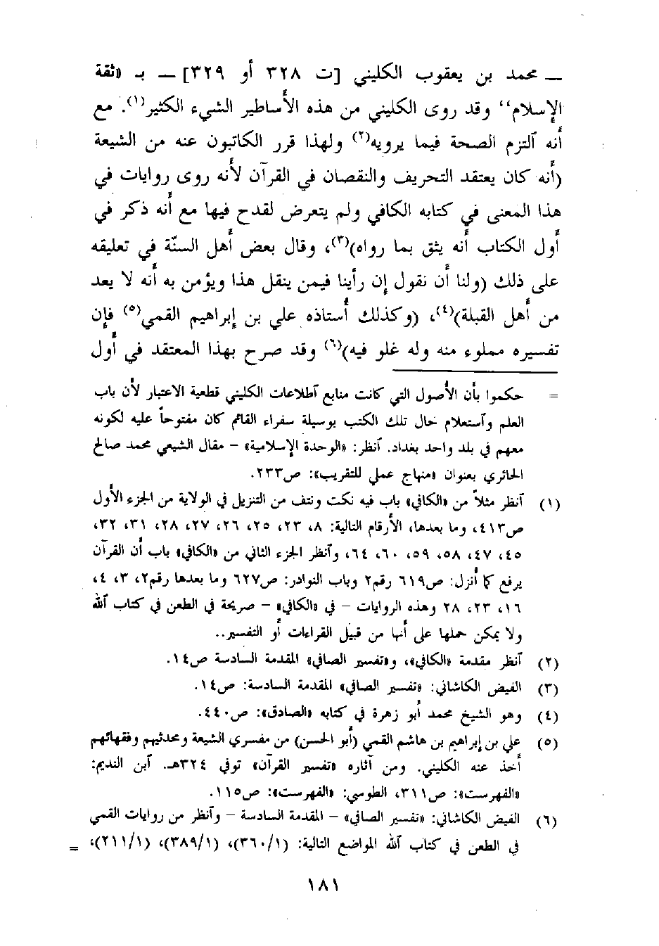 - محمد بن يعقوب الكليني [ت 328 أو 329]- بـ «ثقة الإسلام» ، وقد روى الكليني من هذه الأساطير الشيء الكثير (¬1) . مع أنه التزم الصحة فيما يرويه (¬2) ولهذا قرر الكاتبون عنه من الشيعة (أنه كان يعتقد التحريف والنقصان في القرآن، لأنه روى روايات في هذا المعنى في كتابه الكافي ولم يتعرض لقدح فيها، مع أنه ذكر في أول الكتاب أنه يثق بما رواه) (¬3) ، وقال بعض أَهل السنّة في تعليقه على ذلك: (ولنا أَن نقول إن رأينا فيمن ينقل هذا ويؤمن به أَنه لا يُعدّ من أهل القبلة) (¬4) ، (وكذلك أُستاذه علي بن إبراهيم القمي (¬5) فإنّ تفسيره مملوء منه وله غلو فيه) (¬6) وقد صرح بهذا المعتقد في أوّل