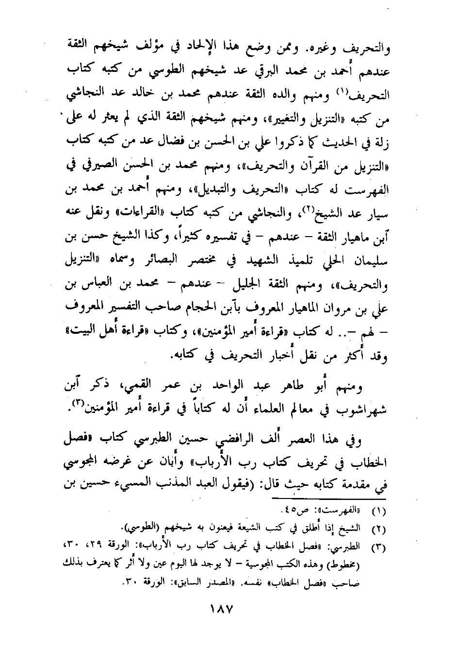 (¬3) الطبرسي: «فصل الخطاب في تحريف كتاب رب الأرباب» : الورقة 29، 30، (مخطوط) ، وهذه الكتب - المجوسية - لا يوجد لها اليوم عين ولا أثر كما يعترف بذلك صاحب «فصل الخطاب» نفسه. «المصدر السابق» : الورقة 30.