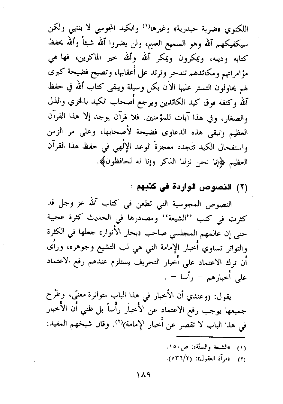 النصوص المجوسية التي تطعن في كتاب الله عز وجل قد كثرت في كتب "الشيعة" ومصادرها في الحديث كثرة عجيبة، حتى إن عالمهم المجلسي صاحب «بحار الأنوار» جعلها في الكثرة والتواتر تساوي أخبار الإمامة التي هي لب التشيع وجوهره، ورأى أن ترك الاعتماد على أخبار التحريف يستلزم عندهم رفع الاعتماد على أخبارهم - رأساً -.