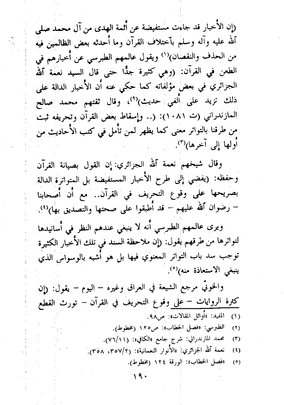 وقال شيخهم نعمة الله الجزائري: إن القول بصيانة القرآن وحفظه: (يفضي إلى طرح الأخبار المستفيضة، بل المتواترة الدالة بصريحها على وقوع التحريف في القرآن.. مع أن أصحابنا - رضوان الله عليهم - قد أطبقوا على صحتها والتصديق بها) (¬4) .