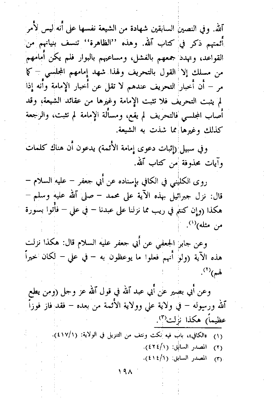 الله. وفي النصين السابقين شهادة من الشيعة نفسها على أنه ليس لأمر أئمتهم ذكر في كتاب الله. وهذه "الظاهرة" تنسف بنيانهم من القواعد، وتهدد جمعهم بالفشل، ومساعيهم بالبوار، فلم يكن أمامهم من مسلك إلا القول بالتحريف، ولهذا شهد إمامهم المجلسي - كما مر - أن أخبار التحريف عندهم لا تقل عن أخبار الإمامة وأنه إذا لم يثبت التحريف فلا تثبت الإمامة وغيرها من عقائد الشيعة. وقد أصاب المجلسي، فالتحريف لم يقع، ومسألة الإمامة لم تثبت، والرجعة كذلك وغيرها مما شذت به الشيعة.