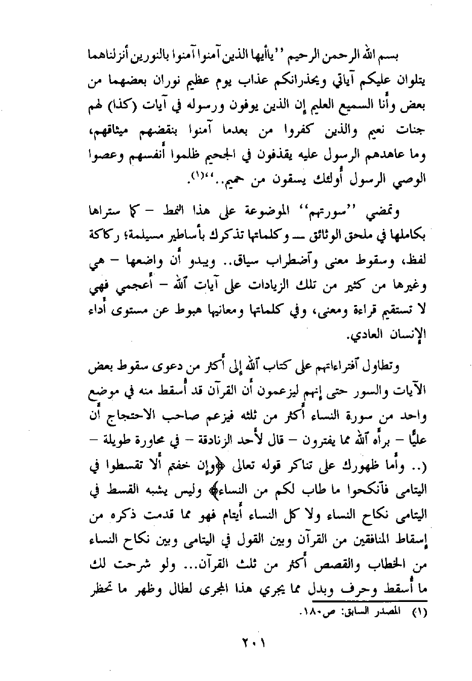 وتمضي "سورتهم" الموضوعة على هذا النمط - كما ستراها بكاملها في ملحق الوثائق - وكلماتها تذكرك بأساطير مسيلمة؛ ركاكة لفظ، وسقوط معنى واضطراب سياق.. ويبدو أن واضعها - هي وغيرها من كثير من تلك الزيادات على آيات الله - أعجمي، فهي لا تستقيم قراءة ومعنى، وفي كلماتها ومعانيها هبوط عن مستوى أداء الإنسان العادي.