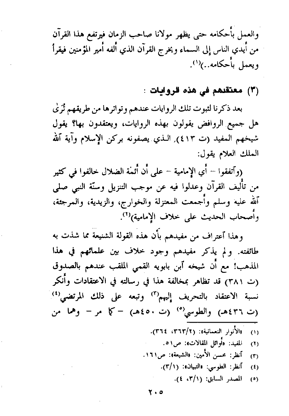 وهذا اعتراف من مفيدهم بأن هذه القولة الشنيعة مما شذت به طائفته. ولم يذكر مفيدهم وجود خلاف بين علمائهم في هذا المذهب! مع أن شيخه ابن بابويه القمي الملقب عندهم بالصدوق (ت 381) قد تظاهر بمخالفة هذا في رسالته في الاعتقادات وأنكر نسبة الاعتقاد بالتحريف إليهم (¬3) وتبعه على ذلك المرتضي (¬4) (ت 436هـ) والطوسي (¬5) (ت 450هـ) - كما مر - وهما من
