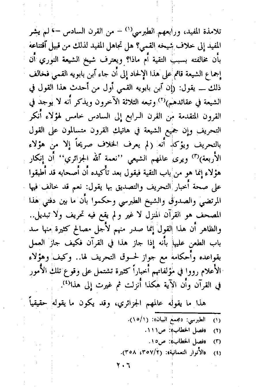 تلامذة المفيد، ورابعهم الطبرسي (¬1) - من القرن السادس -، لم يشر المفيد إلى خلاف شيخه القمي؟ هل تجاهل المفيد لذلك من قبيل اقتناعه بأن مخالفته بسبب التقية أم ماذا؟ ويعترف شيخ الشيعة النوري أن إجماع الشيعة قائم على هذا الإلحاد إلى أن جاء ابن بابويه القمي فخالف ذلك - يقول: (إن ابن بابويه القمي أول من أحدث هذا القول في الشيعة في عقائدهم) (¬2) وتبعه الثلاثة الآخرون، ويذكر أنه لا يوجد في القرون المتقدمة من القرن الرابع إلى السادس خامس لهؤلاء أنكر التحريف، وإن جميع الشيعة في هاتيك القرون متسالمون على القول بالتحريف، ويؤكد أنه (لم يعرف الخلاف صريحاً إلا من هؤلاء الأربعة) (¬3) ، ويرى عالمهم الشيعي "نعمة الله الجزائري" أن إنكار هؤلاء إنما هو من باب التقية، فيقول ـ بعد تأكيده أن أصحابه قد أطبقوا على صحة أخبار التحريف والتصديق بها - يقول: نعم قد خالف فيها المرتضي والصدوق والشيخ الطبرسي وحكموا بأن ما بين دفتي هذا المصحف هو القرآن المنزل لا غير ولم يقع فيه تحريف ولا تبديل.. والظاهر أن هذا القول إنما صدر منهم لأجل مصالح كثيرة منها: سد باب الطعن عليها بأنه إذا جاز هذا في القرآن فكيف جاز العمل بقواعده وأحكامه مع جواز لحوق التحريف لها؟.. وكيف وهؤلاء الأعلام رووا في مؤلفاتهم أخباراً كثيرة تشتمل على وقوع تلك الأمور في القرآن وأن الآية هكذا أُنزلت ثم غيرت إلى هذا (¬4) ؟.