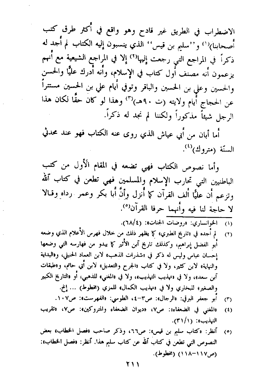 (¬5) انظر: «كتاب سليم بن قيس» : ص 66، وذكر صاحب «فصل الخطاب» بعض النصوص التي تطعن في كتاب الله عن كتاب سليم هذا. انظر: «فصل الخطاب» (ص 117- 118) (مخطوط) .