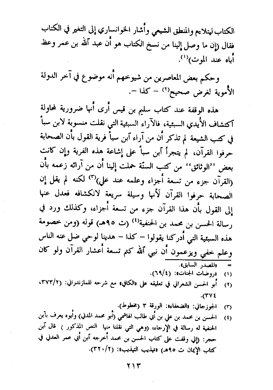 هذه الوقفة عند كتاب سليم بن قيس أرى أنها ضرورية لمحاولة اكتشاف الأيدي السبئية، فالآراء التي نقلت منسوبة لابن سبأ في كتب الشيعة لم تذكر أن من آراء ابن سبأ فرية القول بأن الصحابة حرفوا القرآن، لم يتجرأ ابن سبأ على إشاعة هذه الفرية ـ وإن كانت بعض "الوثائق" من كتب السنّة حملت إلينا أن من آرائه زعمه بأن (القرآن جزء من تسعة أجزاء وعلمه عند علي) (¬3) ـ لكنه لم يقل أن الصحابة حرفوا القرآن، لأنها وسيلة سريعة لانكشافه، فعدل عنها إلى القول بأن هذا القرآن جزء من تسعة أجزاء، وكذلك ورد في رسالة الحسن بن محمد بن الحنفية (¬4) (ت 95هـ) قوله: (ومن خصومة هذه السبئية التي أدركنا يقولوا - كذا -: هدينا لوحي ضل عنه الناس وعلم خفي، ويزعمون أن نبي الله كتم تسعة أعشار القرآن، ولو كان