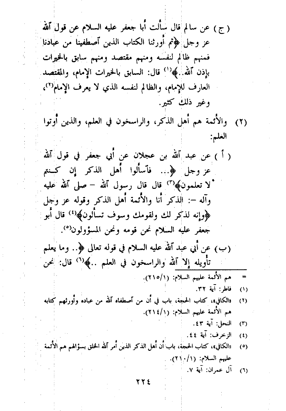 (¬2) «الكافي» ، كتاب الحجة، باب في أن من اصطفاه الله من عباده وأورثهم كتابه هم الأئمة عليهم السلام: (1/214) .