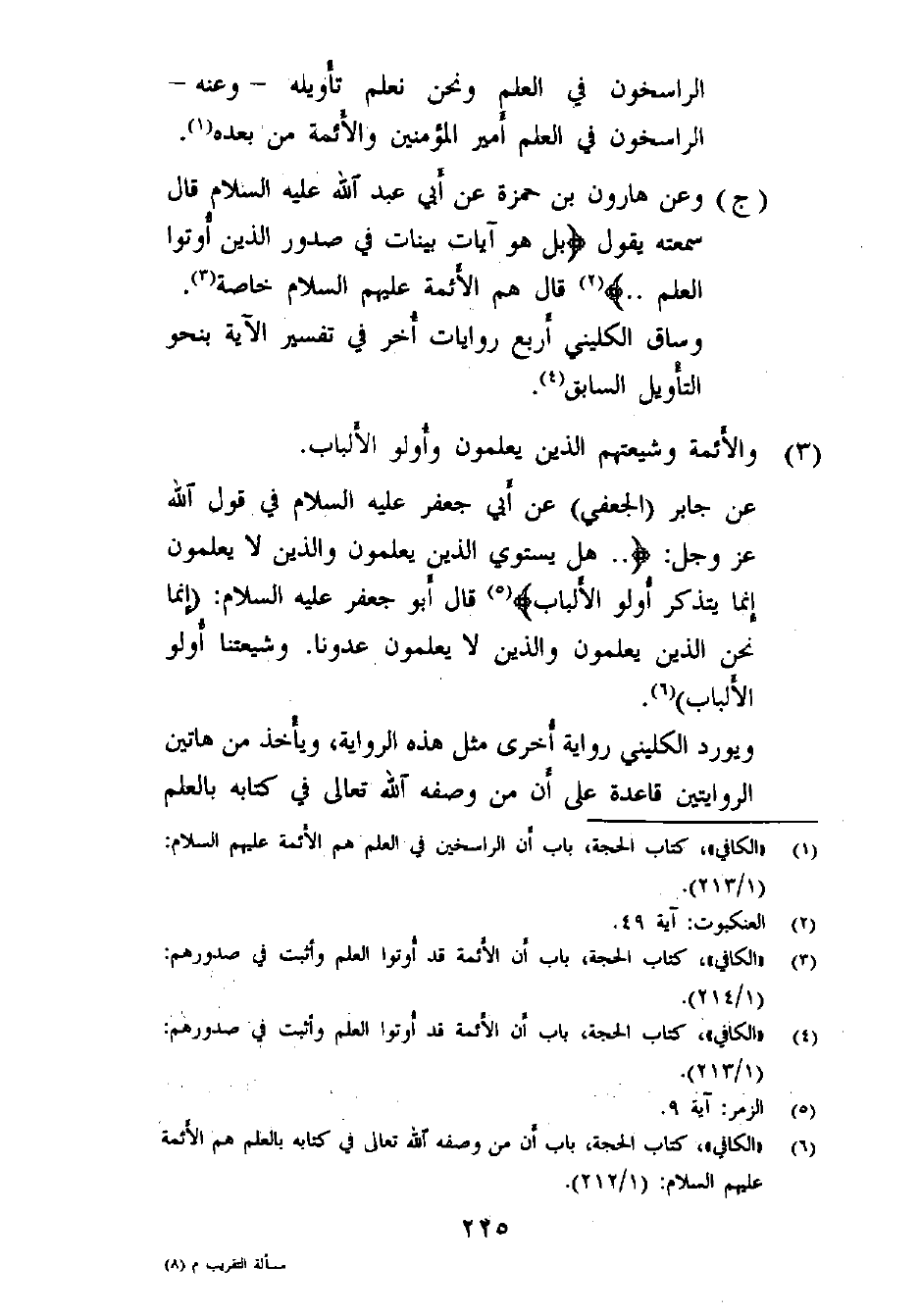 (ج) وعن هارون بن حمزة عن أبي عبد الله (قال: سمعته يقول: (بل هو آيات بينات في صدور الذين أوتوا العلم.. ((¬2) قال: هم الأئمة عليهم السلام خاصة (¬3) . وساق الكليني أربع روايات أخر في تفسير الآية بنحو التأويل السابق (¬4) .
