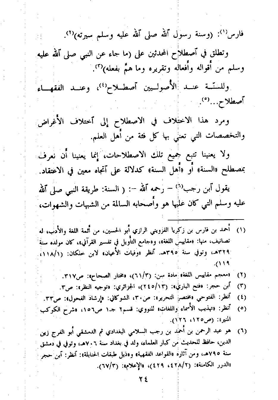 يقول ابن رجب (¬6) - رحمه الله -: (السنة: طريقة النبي - صلى الله عليه وسلم - التي كان عليها هو وأصحابه السالمة من الشبهات والشهوات،