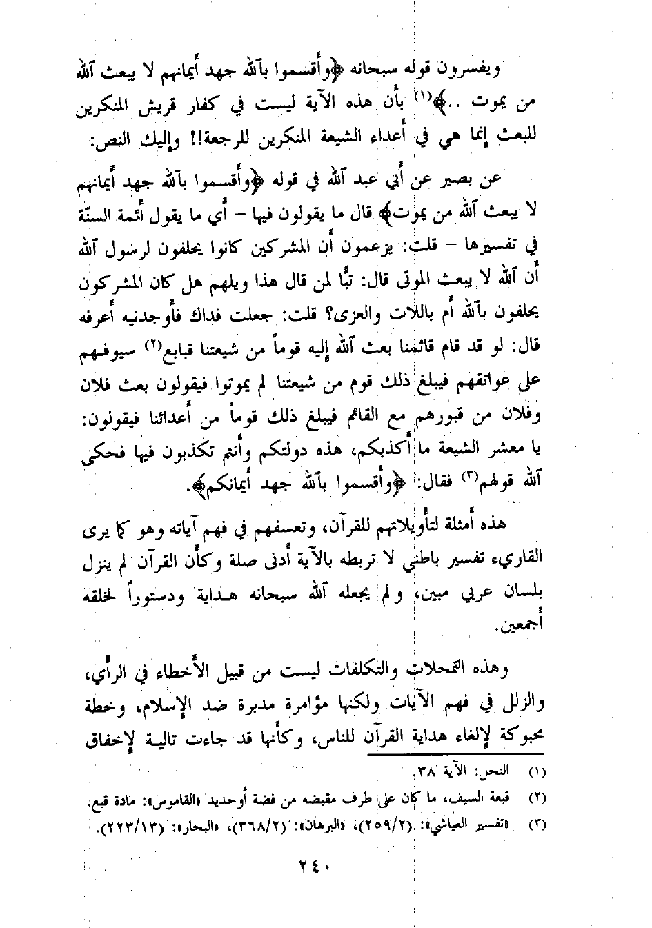 ويفسرون قوله سبحانه: (وأقسموا بالله جهد أيمانهم لا يبعث الله من يموت.. ((¬1) بأن هذه الآية ليست في كفار قريش المنكرين للبعث، إنما هي في أعداء الشيعة المنكرين للرجعة!! وإليك النص: