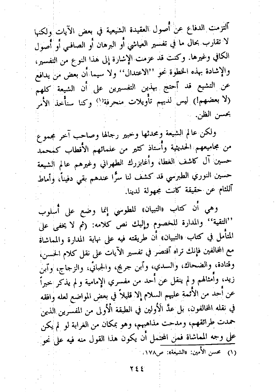 التزمت الدفاع عن أصول العقيدة الشيعية في بعض الآيات ولكنها لا تقارب بحال ما في تفسير العياشي أو البرهان أو الصافي أو أصول الكافي وغيرها. وكنت قد عزمت الإشارة إلى هذا النوع من التفسير، والإشادة بهذه الخطوة نحو "الاعتدال" ولا سيما أن بعض من يدافع عن التشيع قد احتج بهذين التفسيرين على أن الشيعة كلهم (لا بعضهم!) ليس لديهم تأويلات منحرفة (¬1) وكنا سنأخذ الأمر بحسن الظن.