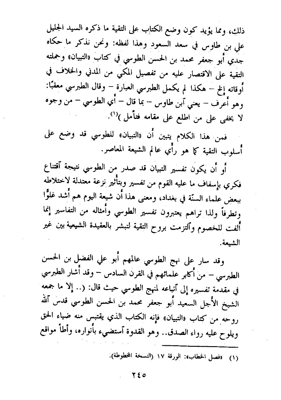فمن هذا الكلام يتبين أن «التبيان» للطوسي قد وضع على أسلوب التقية كما هو رأي عالم الشيعة المعاصر.
