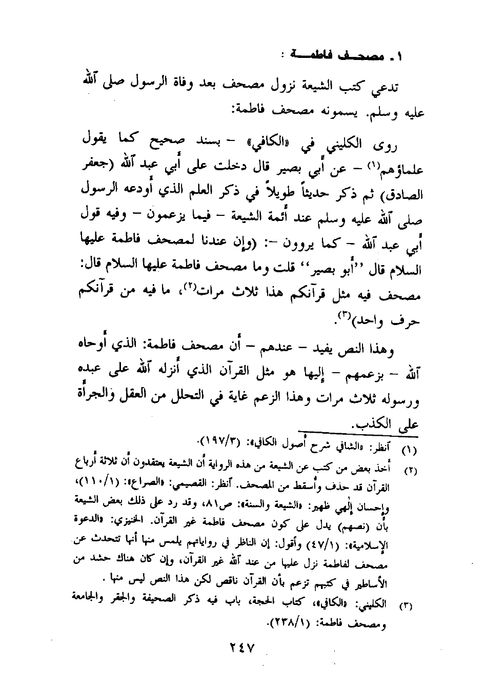 (¬2) أخذ بعض من كتب عن الشيعة من هذه الرواية أن الشيعة يعتقدون أن ثلاثة أرباع القرآن قد حذف وأُسقط من الصحف. انظر: القصيمي: «الصراع» : (1/110) ، وإحسان إلهي ظهير: «الشيعة والسنة» : ص 81، وقد رد على ذلك بعض الشيعة بأن (نصهم) يدل على كون مصحف فاطمة غير القرآن. الخنيزي: «الدعوة الإسلامية» : (1/47) ، وأقول: إن الناظر في رواياتهم يلمس منها أنها تتحدث عن مصحف لفاطمة نزل عليها من عند الله غير القرآن، وإن كان هناك حشد من الأساطير في كتبهم تزعم بأن القرآن ناقص لكن هذا النص ليس منها.