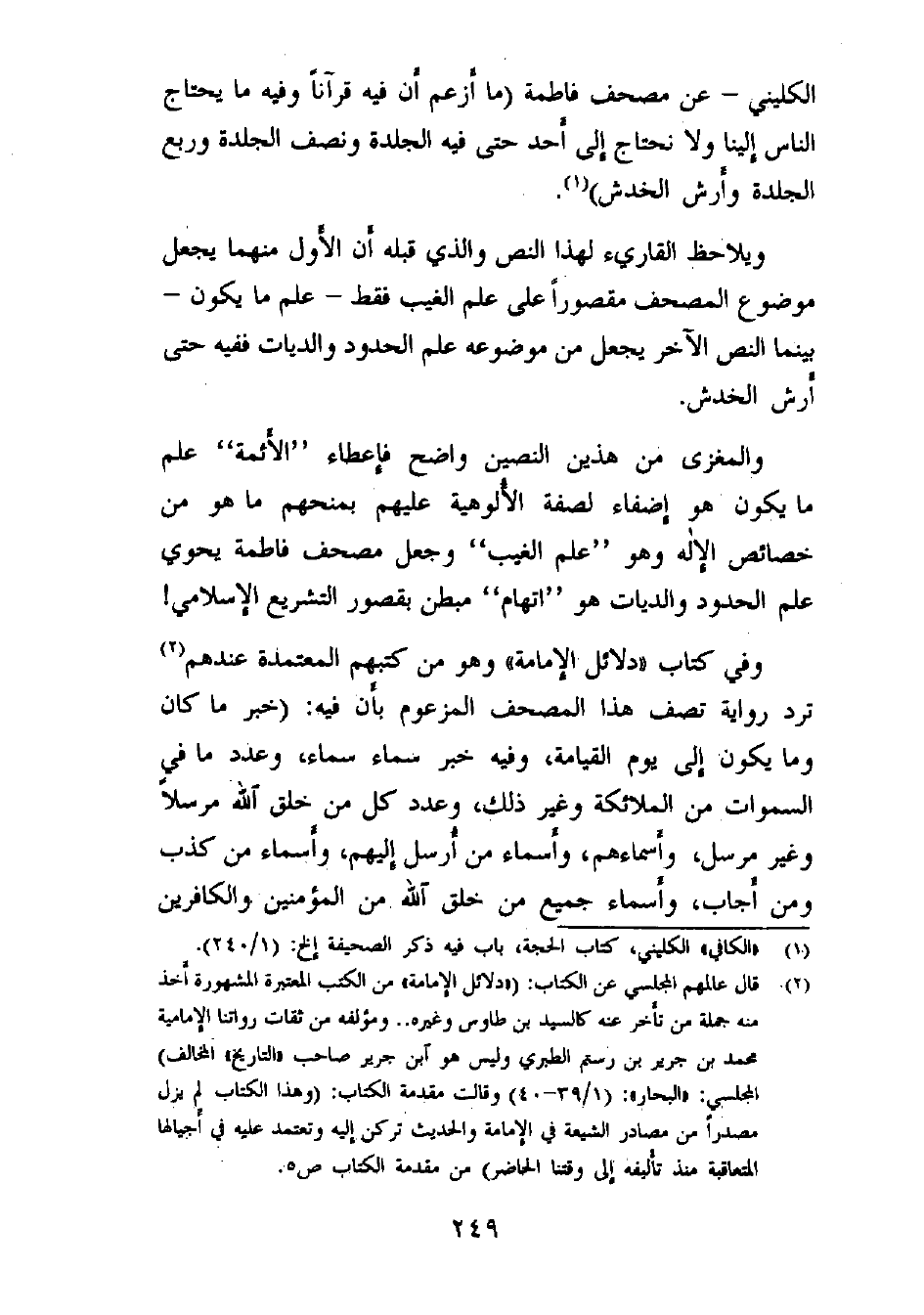 الكليني - عن مصحف فاطمة: (ما أزعم أن فيه قرآناً وفيه ما يحتاج الناس إلينا ولا نحتاج إلى أحد، حتى فيه الجلدة ونصف الجلدة وربع الجلدة وأرش الخدش) (¬1) .