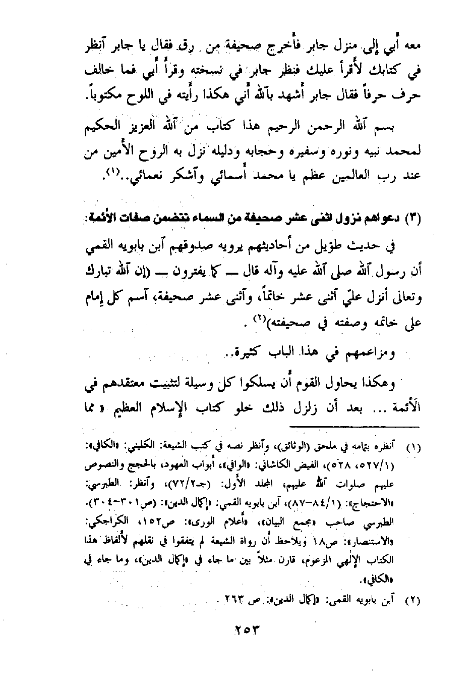 (¬1) انظره بتمامه في ملحق (الوثائق) ، وانظر نصه في كتب الشيعة: الكليني: «الكافي» : (1/527، 528) ، الفيض الكاشاني: «الوافي» ، أبواب العهود، بالحجج والنصوص عليهم صلوات الله عليهم، المجلد الأول: (جـ2/72) ، وانظر: الطبرسي: «الاحتجاج» : (1/84- 87) ، ابن بابويه القمي: «إكمال الدين» : (ص 301- 304) . الطبرسي صاحب «مجمع البيان» ، «أعلام الورى» : ص 152، الكراجكي: «الاستنصار» : ص 18. ويلاحظ أن رواة الشيعة لم يتفقوا في نقلهم لألفاظ هذا الكتاب الإلهي المزعوم، قارن مثلاً بين ما جاء في «إكمال الدين» ، وما جاء في «الكافي» .