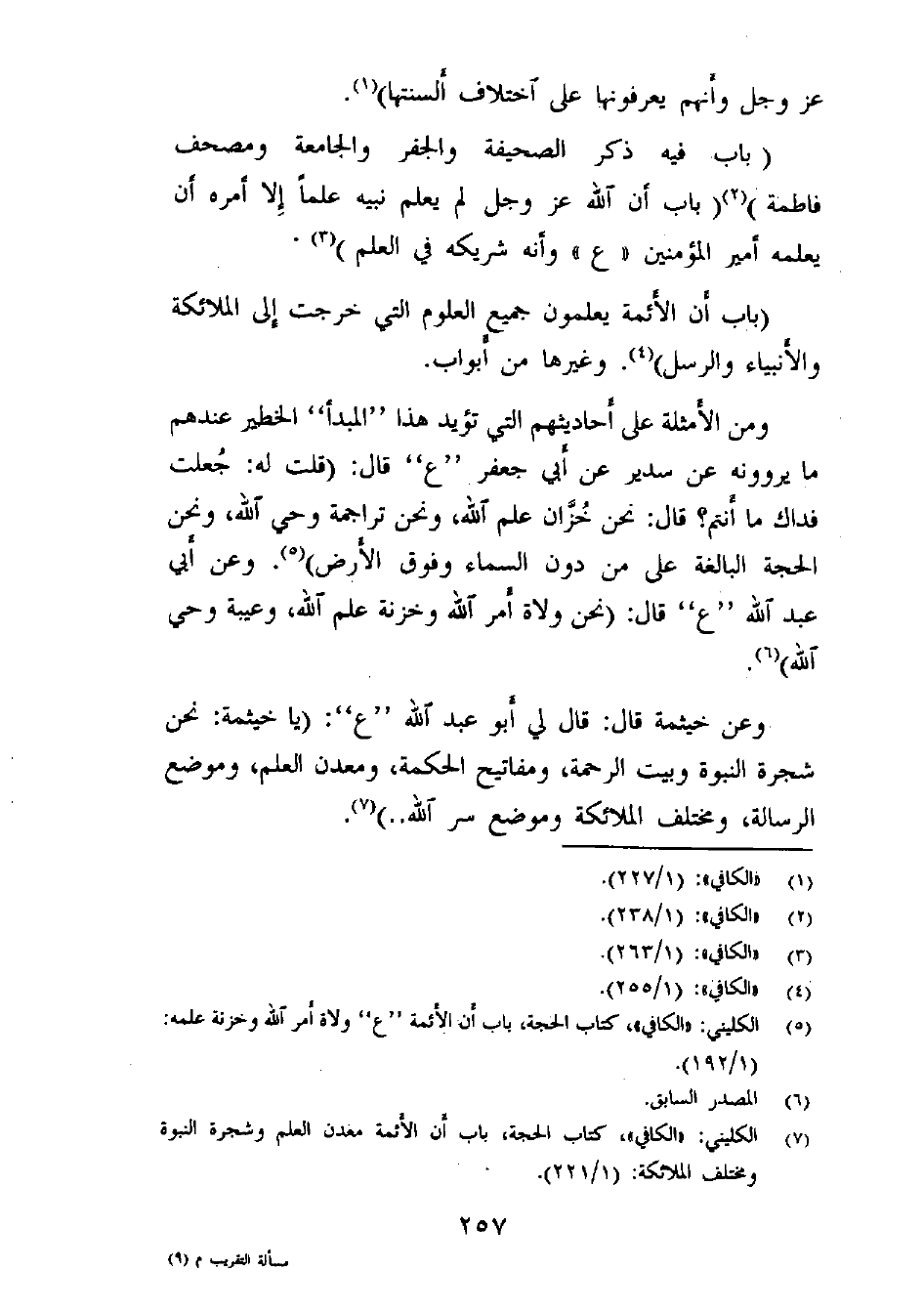 (باب أن الأئمة يعلمون جميع العلوم التي خرجت إلى الملائكة والأنبياء والرسل) (¬4) . وغيرها من أبواب.