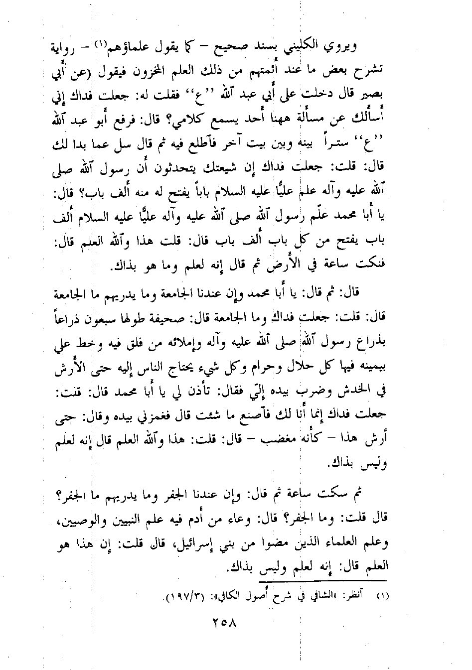 ويروي الكليني بسند صحيح - كما يقول علماؤهم (¬1) - رواية تشرح بعض ما عند أئمتهم من ذلك العلم المخزون فيقول: (عن أبي بصير قال: دخلت على أبي عبد الله "ع" فقلت له: جعلت فداك، إني أسألك عن مسألة، ههنا أحد يسمع كلامي؟ قال: فرفع أبو عبد الله "ع" ستراً بينه وبين بيت آخر فاطلع فيه ثم قال: سل عما بدا لك، قال: قلت: جعلت فداك إن شيعتك يتحدثون أن رسول الله صلى الله عليه وآله علم عليّاً (باباً يفتح له منه ألف باب؟ قال: يا أبا محمد علّم رسول الله صلى الله عليه وآله عليّاً (ألف باب، يفتح من كل باب ألف باب، قال: قلت هذا والله العلم، قال: فنكت ساعة في الأرض ثم قال: إنه لعلم وما هو بذاك.