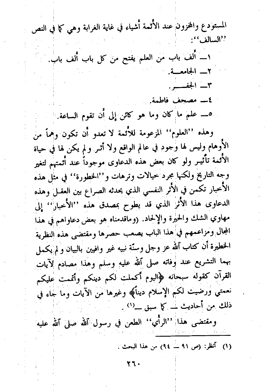 وهذه "العلوم" المزعومة للأئمة لا تعدو أن تكون وهماً من الأوهام وليس لها وجود في عالم الواقع ولا أثر، ولم يكن لها في حياة الأئمة تأثير ولو كان بعض هذه الدعاوى موجوداً عند أئمتهم لتغير وجه التاريخ ولكنها مجرد خيالات وترهات، و"الخطورة" في مثل هذه الأخبار تكمن في الأثر النفسي الذي يحدثه الصراع بين العقل وهذه الدعاوى، هذا الأثر الذي قد يطوح بمصدق هذه "الأخبار" إلى مهاوي الشك والحيرة والإلحاد. (وما قدمناه هو بعض دعاواهم في هذا المجال ومزاعمهم في هذا الباب يصعب حصرها، ومقتضى هذه النظرية الخطيرة أن كتاب الله (وسنّة نبيه غير وافيين بالبيان ولم يكمل بهما التشريع عند وفاته ?، وهذا مصادم لآيات القرآن كقوله سبحانه: (اليوم أكملت لكم دينكم وأتممت عليكم نعمتي ورضيت لكم الإسلام ديناً (وغيرها من الآيات وما جاء في ذلك من أحاديث - كما سبق - (¬1) .