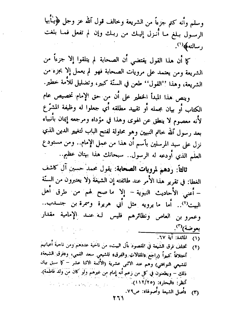 ثالثاً: ردهم لمرويات الصحابة: يقول محمد حسين آل كاشف الغطا ـ في تقرير هذا الأمر عند طائفته ـ إن الشيعة (لا يعتبرون من السنّة - أعني الأحاديث النبوية - إلا ما صح لهم من طرق أهل البيت (¬2) .. أما ما يرويه مثل أبي هريرة وسمرة بن جندب.. وعمرو بن العاص ونظرائهم فليس له عند الإمامية مقدار بعوضة) (¬3) .