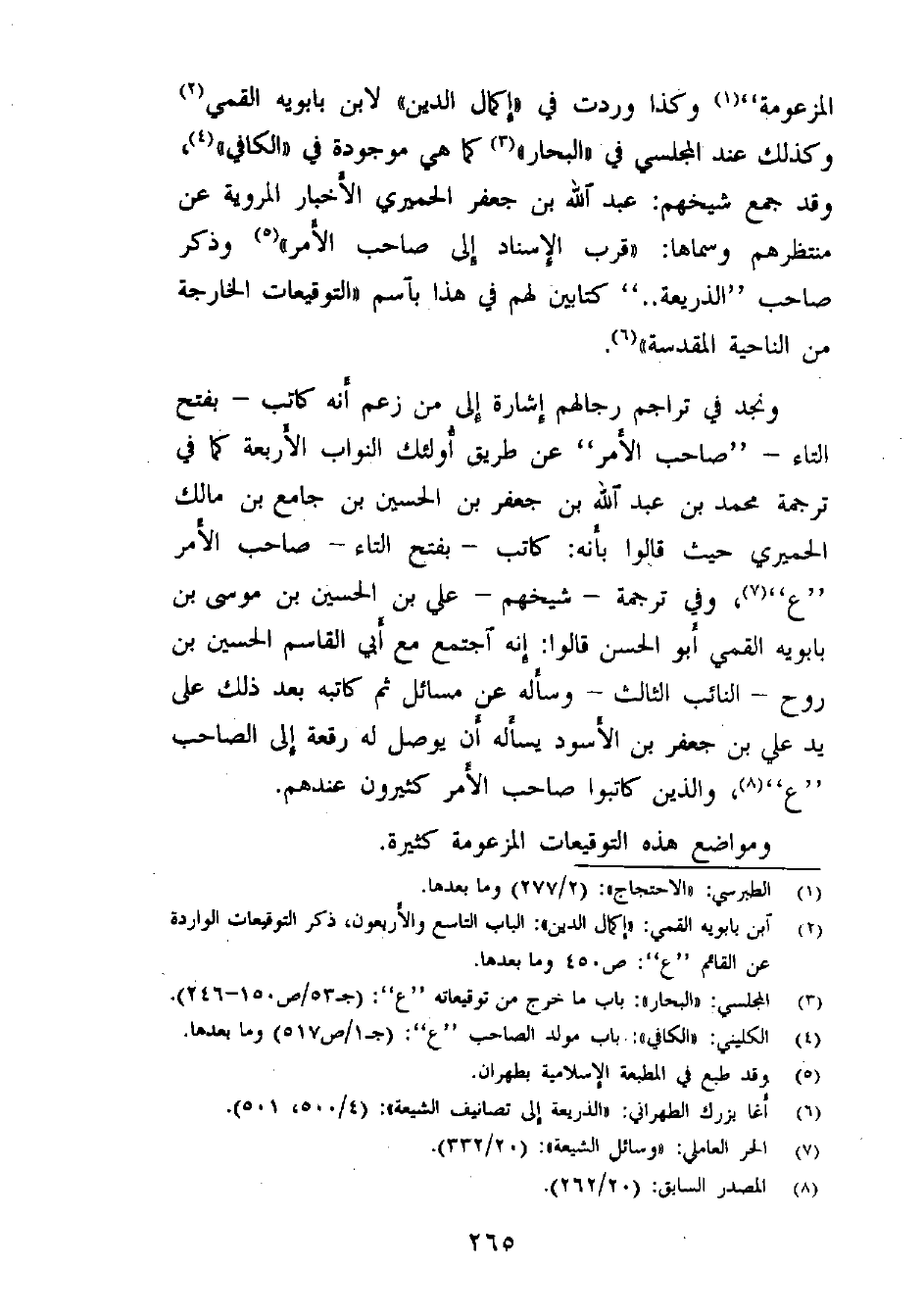 المزعومة" (¬1) ، وكذا وردت في «إكمال الدين» لابن بابويه القمي (¬2) وكذلك عند المجلسي في «البحار» (¬3) كما هي موجودة في «الكافي» (¬4) ، وقد جمع شيخهم: عبد الله بن جعفر الحميري الأخبار المروية عن منتظرهم وسماها: «قرب الإسناد إلى صاحب الأمر» (¬5) وذكر صاحب "الذريعة.." كتابين لهم في هذا باسم «التوقيعات الخارجة من الناحية المقدسة» (¬6) .