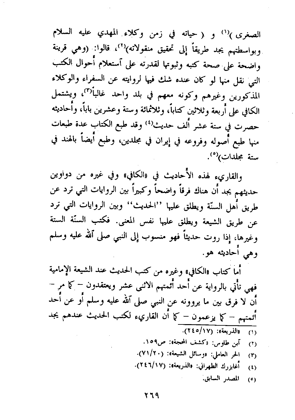الصغرى) (¬1) و (حياته في زمن وكلاء المهدي (وبواسطتهم يجد طريقاً إلى تحقيق منقولاته) (¬2) ، قالوا: (وهي قرينة واضحة على صحة كتبه وثبوتها لقدرته على استعلام أحوال الكتب التي نقل منها لو كان عنده شك فيها لروايته عن السفراء والوكلاء المذكورين وغيرهم وكونه معهم في بلد واحد غالباً (¬3) ، ويشتمل الكافي على أربعة وثلاثين كتاباً، وثلاثمائة وستة وعشرين باباً، وأحاديثه حصرت في ستة عشر ألف حديث (¬4) وقد طبع الكتاب عدة طبعات منها طبع أصوله وفروعه في إيران في مجلدين، وطبع أيضاً بالهند في ستة مجلدات) (¬5) .