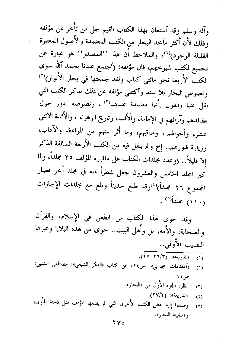 وآله وسلم، وقد استعان بهذا الكتاب القيم جل من تأخر عن مؤلفه، وذلك لأن أكثر مآخذ البحار من الكتب المعتمدة والأصول المعتبرة القليلة الوجود) (¬1) ، والملاحظ أن هذا "المصدر" هو عبارة عن تجميع لكتب شيوخهم، قال مؤلفه: (اجتمع عندنا بحمد الله سوى الكتب الأربعة نحو مائتي كتاب، ولقد جمعتها في بحار الأنوار) (¬2) ونصوص البحار بلا سند، واكتفى مؤلفه عن ذلك بذكر الكتب التي نقل عنها والقول بأنها معتمدة عندهم (¬3) ، ونصوصه تدور حول عقائدهم وآرائهم في الإمامة، والأئمة، وتاريخ الزهراء، والأئمة الإثني عشر، وأحوالهم، ومناقبهم، وما أُثر عنهم من المواعظ والآداب، وزيارة قبورهم.. إلخ. ولم ينقل فيه من الكتب الأربعة السالفة الذكر إلا قليلاً.. (وعدد مجلدات الكتاب على ما قرره المؤلف 25 مجلداً، ولما كبر المجلد الخامس والعشرون جعل شطراً منه في مجلد آخر فصار المجموع 26 مجلداً) (¬4) وقد طبع حديثاً وبلغ مع مجلدات الإجازات (110) مجلداً (¬5) .